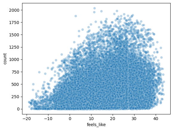 sns.scatterplot(x='feels_like', y='count', data=bike_df, alpha= 0.3)