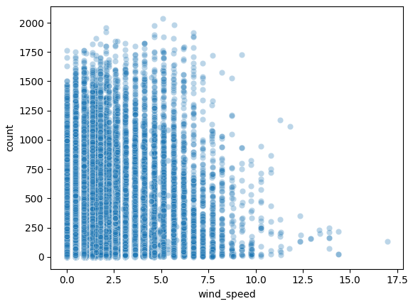 sns.scatterplot(x='wind_speed', y='count', data=bike_df, alpha=0.3)