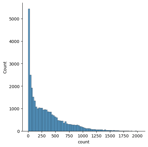 sns.displot(bike_df['count'])