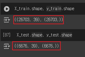 | X 학습 : 26703개의 샘플(행)과 39개의 특성(열) X 테스트 : 6676개의 샘플(행)과 39개의 특성(열) y 학습 : 26703개의 샘플(행) y 테스트 : 6676개의 샘플(행) |
