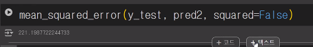 - 테스트 데이터의 실제 값(y_test)과 모델의 예측 값(pred2) 사이의 평균 제곱 오차(MSE)를 계산