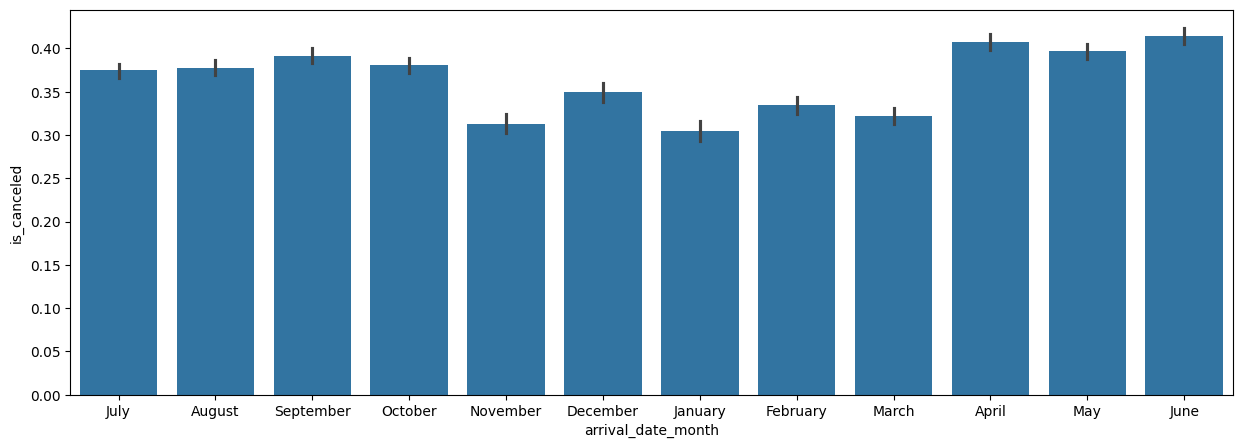 sns.barplot(x=hotel_df['arrival_date_month'], y=hotel_df['is_canceled'], order=months)