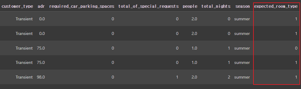 hotel_df['expected_room_type'] = (hotel_df['reserved_room_type'] == hotel_df['assigned_room_type']).astype(int)