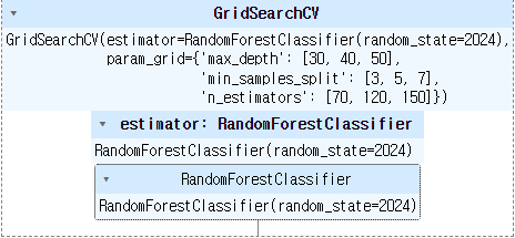 - 랜덤 포레스트 모델을 사용하여 그리드 서치(Grid Search)를 수행하여 최적의 하이퍼파라미터를 찾는 과정