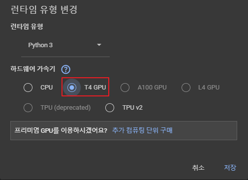* 상단 메뉴 -> 런타임 -> 런타임 유형변경 -> 하드웨어 가속기를 GPU로 변경 -> 저장 -> 다시 시작 및 모두 실행