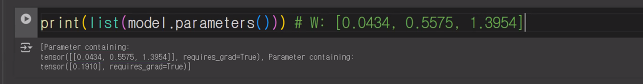 | model의 학습 가능한 모든 매개변수들을 리스트로 변환하고 출력합니다. nn.Linear(3, 1) 모델은 3개의 입력과 1개의 출력을 가지므로, 가중치 행렬 W는 (1, 3) 형태이고, 편향 b는 (1,) 형태입니다.