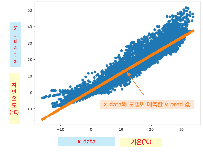 - 데이터 포인트와 학습된 모델에 의한 예측 포인트를 포함하는 산점도 그리기