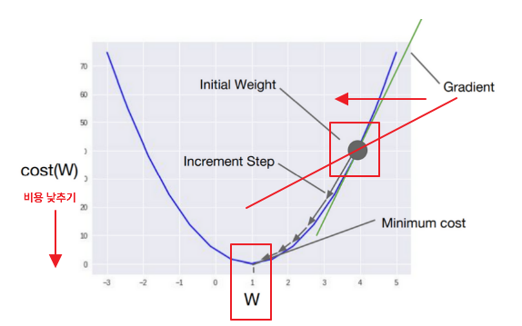 * 학습률(Learning rate) : 한번 W를 움직이는 거리 (increment strp)