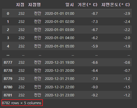 - [ '기온(°C)' ]과 [ '지면온도(°C)' ]을 추출하여 PyTorch 텐서로 변환