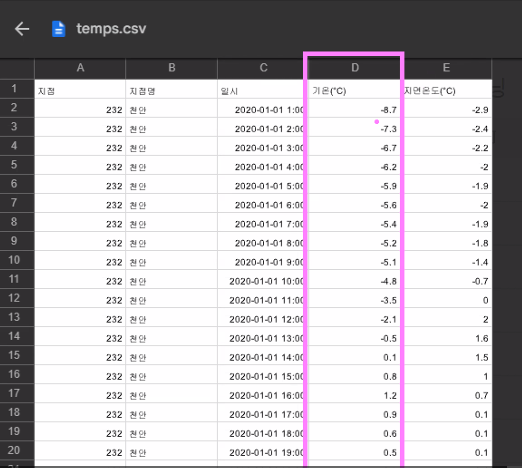 df = pd.read_csv('/content/drive/MyDrive/1. KDT/6. 머신러닝 딥러닝/데이터/temps.csv', encoding='ms949' )
