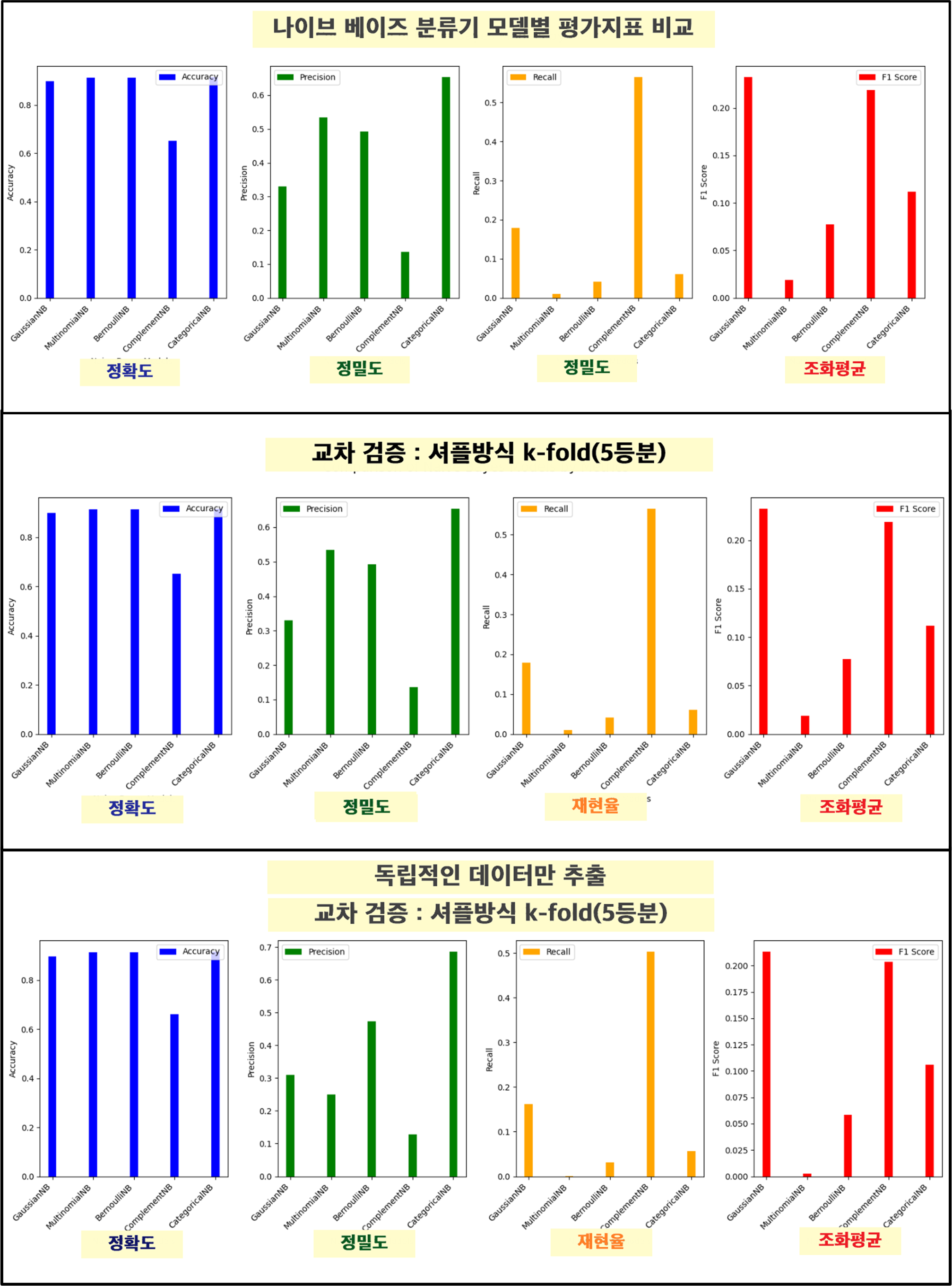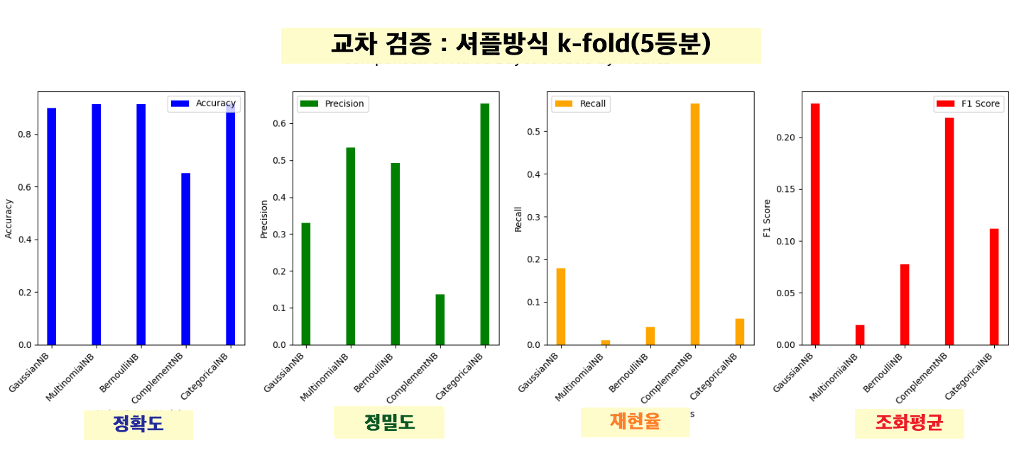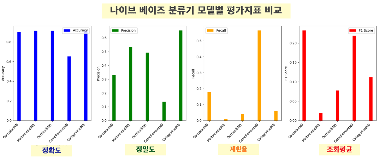 model_names = ['GaussianNB', 'MultinomialNB', 'BernoulliNB', 'ComplementNB', 'CategoricalNB']