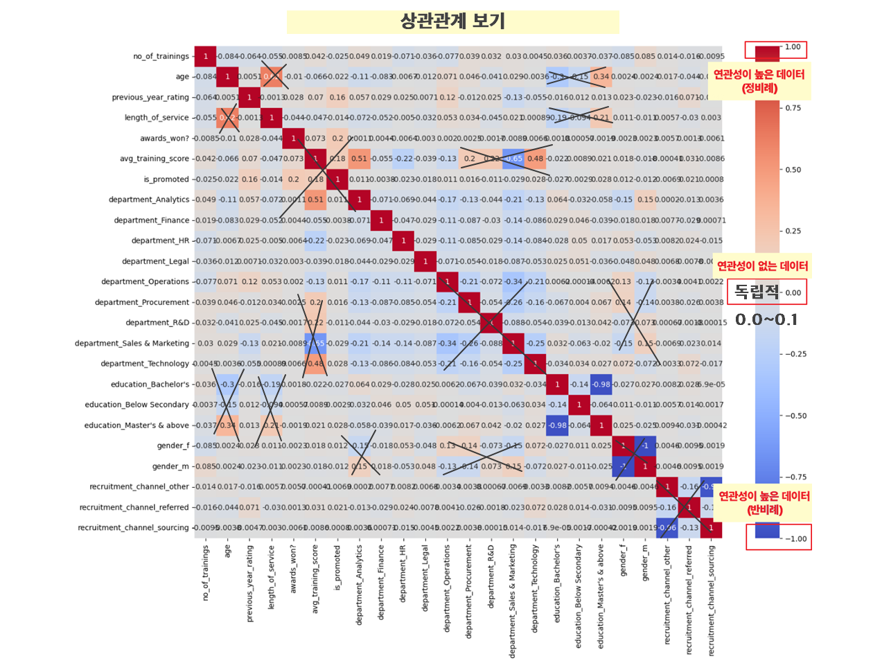 전년도 고과점수는 엮인 칼럼이 많아 여러가지 칼럼들과 상관계수가 높게 나타남