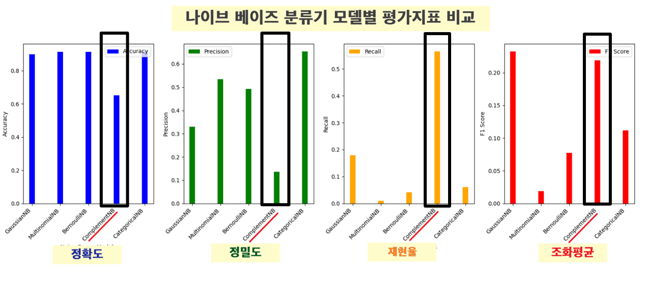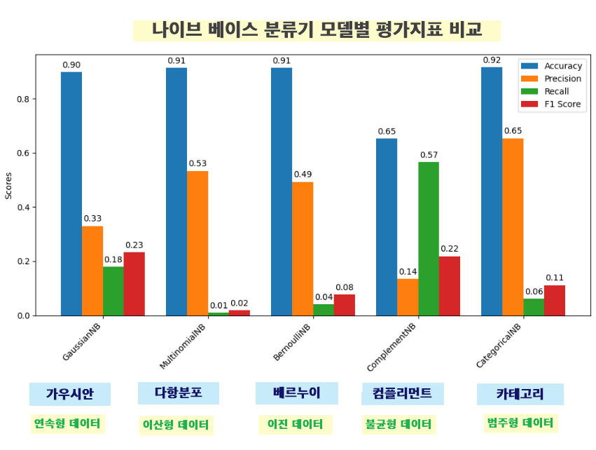 Complement Naive Bayes는 불균형 데이터셋에 더 적합하며, 다항 분포를 따르는 데이터에서 더 나은 성능을 발휘할 수 있습니다.