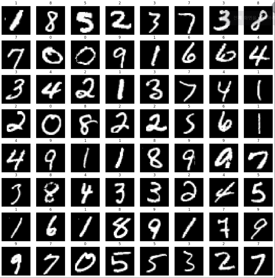 요약이 코드는 테스트 데이터셋에서 데이터를 로드하고, 첫 번째 미니배치의 이미지를 8x8 격자로 시각화하여 표시합니다. 각 이미지는 흑백으로, 해당 이미지의 레이블 값이 제목으로 설정됩니다. 이를 통해 데이터셋이 제대로 로드되었는지와 이미지가 정확히 시각화되었는지를 확인할 수 있습니다. |
