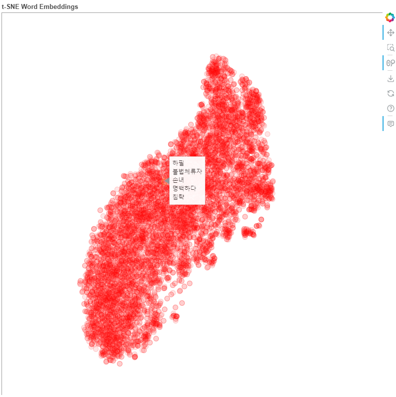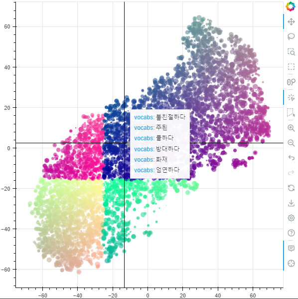 ◼ Bokeh 라이브러리를 사용하여 t-SNE로 차원 축소된 단어 벡터를 시각화