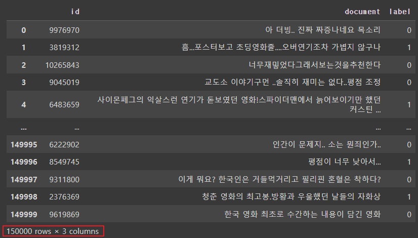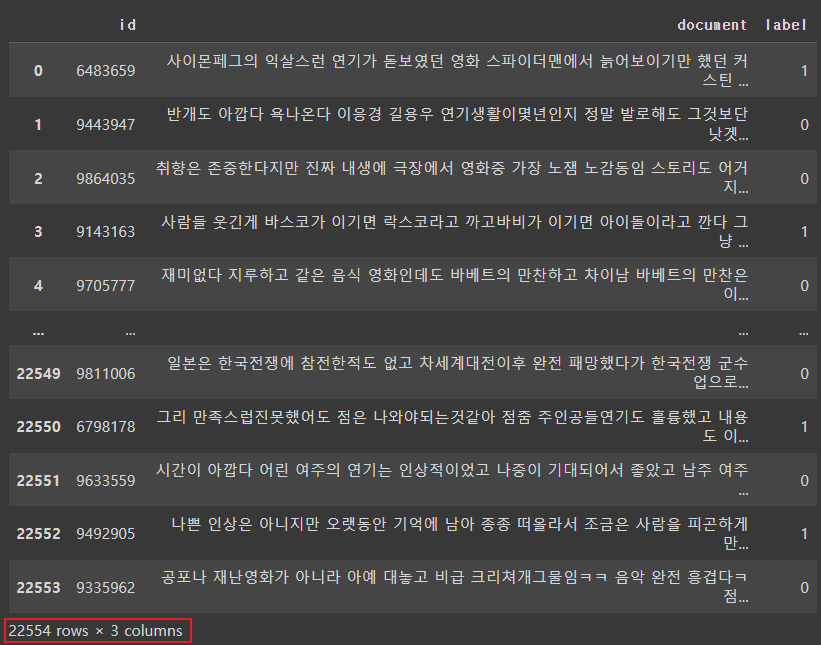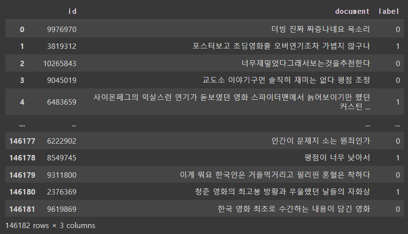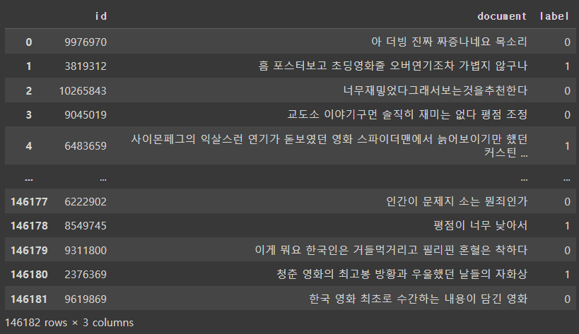 - 리뷰가 긍정인 경우1, 부정인 경우 0으로 표시한 레이블로 구성되어 있음