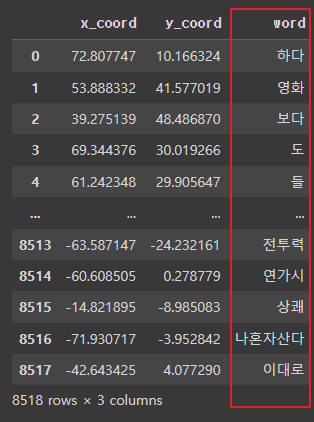 # word_vector_list를 numpy 배열로 변환한 후 TSNE 모델에 fitting 및 변환을 수행