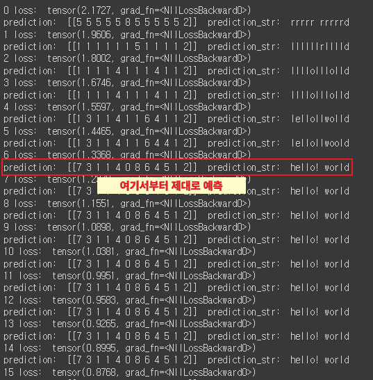 | 입력 데이터: tensor([[[1., 0., 0., 0.], [0., 1., 0., 0.], [0., 0., 1., 0.], [0., 0., 1., 0.], [0., 0., 0., 1.]], [[0., 1., 0., 0.], [0., 0., 0., 1.], [0., 0., 1., 0.], [0., 0., 1., 0.], [0., 0., 1., 0.]], [[0., 0., 1., 0.], [0., 0., 1., 0.], [0., 1., 0., 0.], [0., 1., 0., 0.], [0., 0., 1., 0.]]]) 출력 데이터: tensor([[[-0.5207, 0.9362], [-0.6398, 0.7532], [-0.5574, 0.8718], [-0.5574, 0.8718], [-0.1133, 0.7588]], [[-0.9055, 0.8389], [-0.6818, 0.8142], [-0.8767, 0.9132], [-0.8767, 0.9132], [-0.7872, 0.9210]], [[-0.9112, 0.8984], [-0.8855, 0.9052], [-0.9334, 0.8133], [-0.9334, 0.8133], [-0.9070, 0.9083]]], grad_fn=<StackBackward0>) 은닉 상태: tensor([[[-0.9112, 0.8984], [-0.8855, 0.9052], [-0.9334, 0.8133], [-0.9334, 0.8133], [-0.9070, 0.9083]]], grad_fn=<StackBackward0>) |