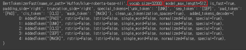 tokenizer = AutoTokenizer.from_pretrained('Huffon/klue-roberta-base-nli')