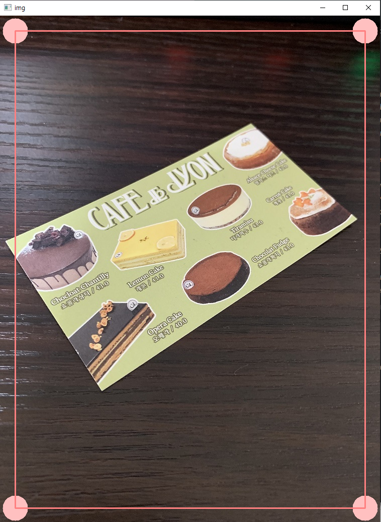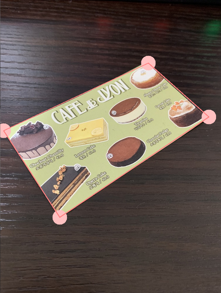 cv2.line(image, points[3], points[0], (255, 0, 255), 2) # 마지막 점과 첫 점을 연결하는 선