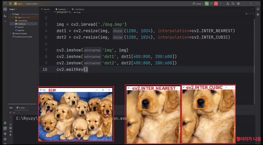 cv2.resize(영상, 결과, x와 y방향 스케일 비율, 보간법)