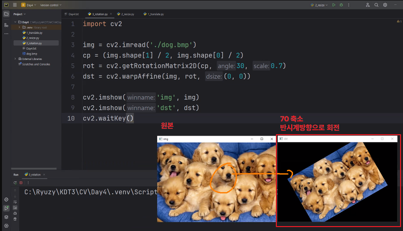 | 영상의 특정 각도 만큼 회전시키는 변환(반시계 방향) * 회전각도: 반시계방향(기본값), 음수는 시계방향 * 확대비율: 0~1 사이의 실수 |