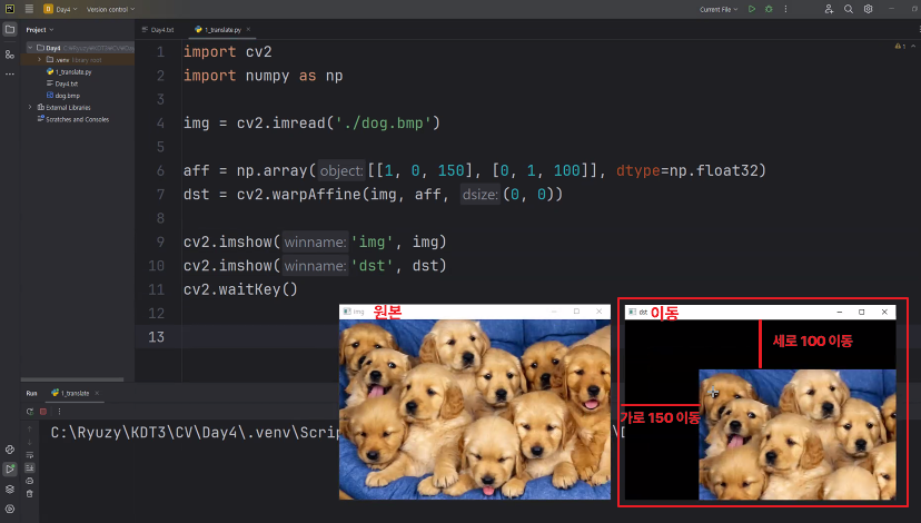 | 이미지 이동(translate) : (0,0)을 매게변수로 전달하면 입력 영상과 같은 행렬을 반환 원래 있던 좌표에 이동시키려는 거리 만큼 연산(shift) |