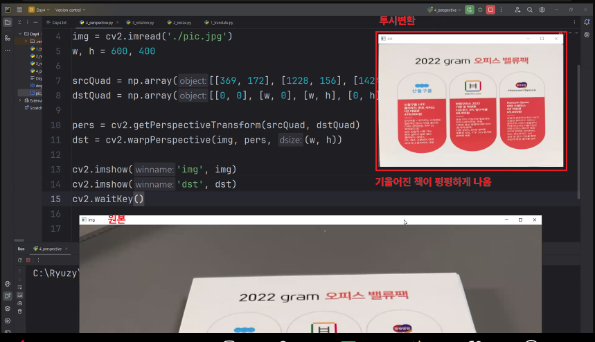 cv2.getPerspectiveTransforms(영상, 4개의 결과 좌표점) -> 투시 변환 행렬 cv2.wrapPerspective(영상, 투시 변환 행렬, 결과 영상 크기) |