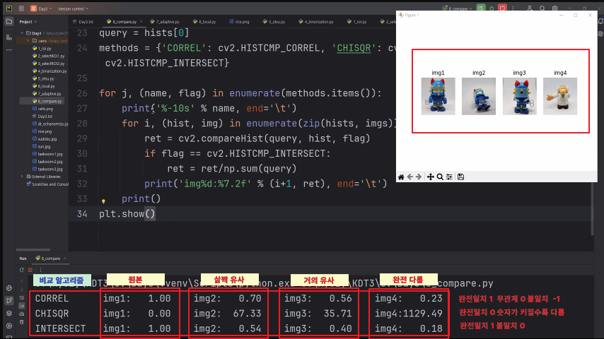cv2.compareHist(히스트그램1, 히스트그램2, 알고리즘) cv2.HISTCMP_CORREL: 상관관계(1: 완정 일치, -1: 완전 불일치, 0: 무관계) |