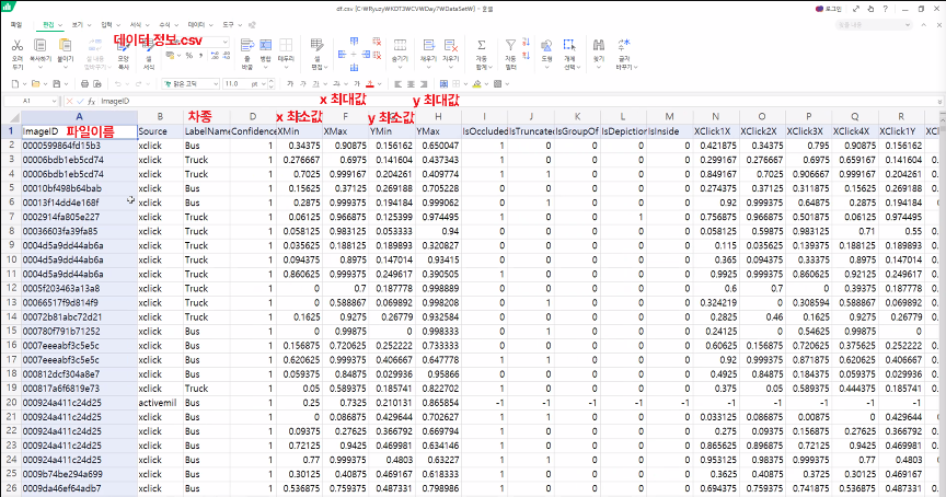 | array([[0.62625 , 0.4031045, 0.565 , 0.493885 ]]) -------------------------------------------------------------------- 이번에는 좌표를 왼쪽 상단 모서리 (XMin, YMin)에서 중심 좌표 (CX, CY)로 변환