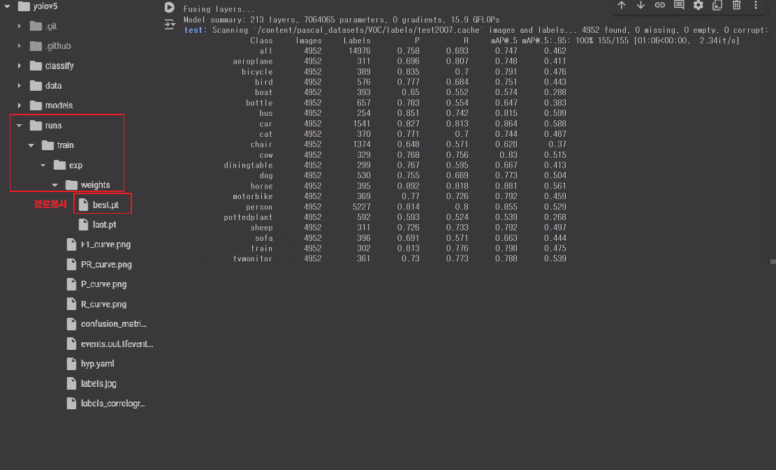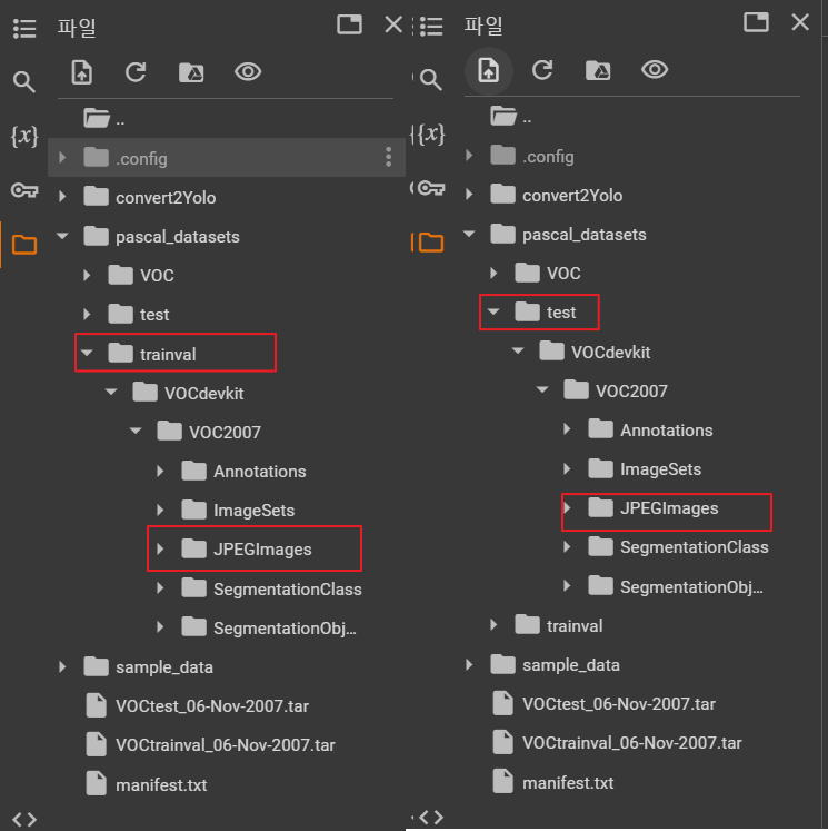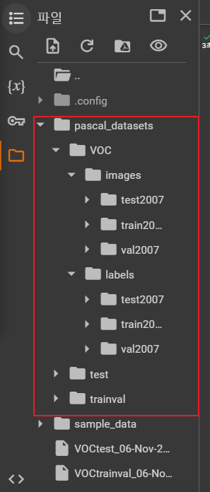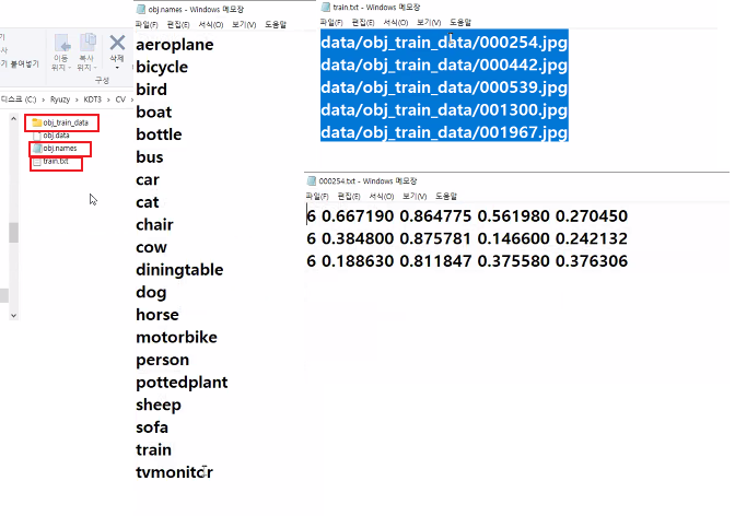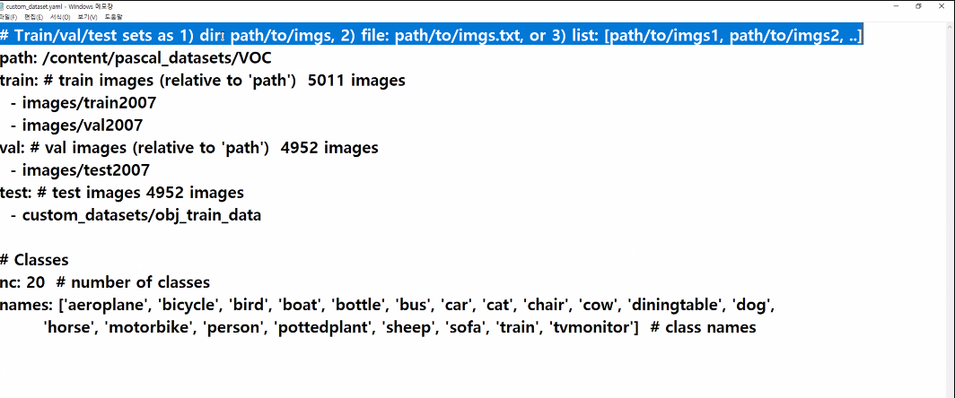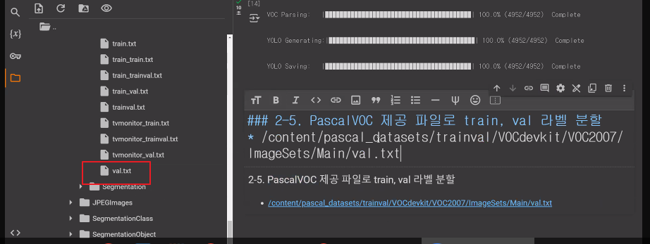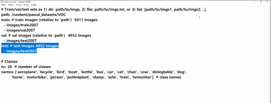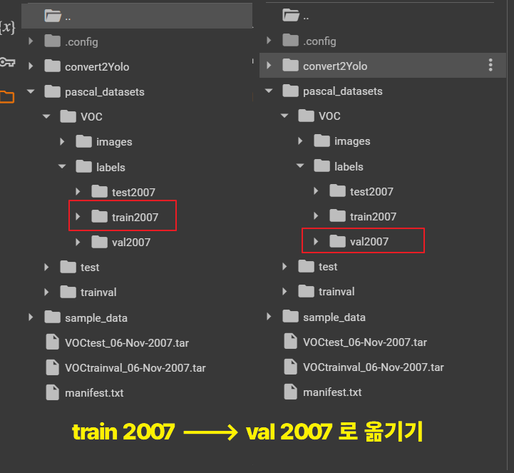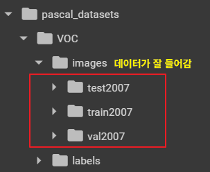 * /content/pascal_datasets/trainval/VOCdevkit/VOC2007/ImageSets/Main/val.txt * /content/pascal_datasets/VOC/labels/train2007 파일 중 위 txt 문서에 있는 파일을 /content/pascal_datasets/VOC/labels/val2007 로 옮기기