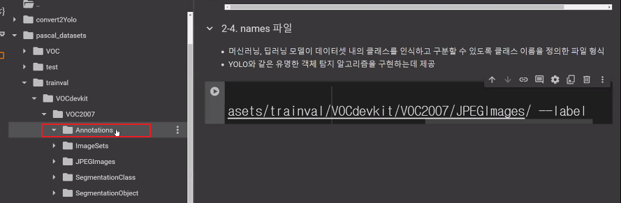 * /content/pascal_datasets/trainval/VOCdevkit/VOC2007/ImageSets/Main/val.txt * /content/pascal_datasets/VOC/labels/train2007 파일 중 위 txt 문서에 있는 파일을 /content/pascal_datasets/VOC/labels/val2007 로 옮기기