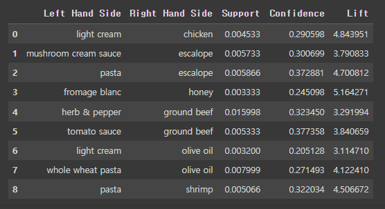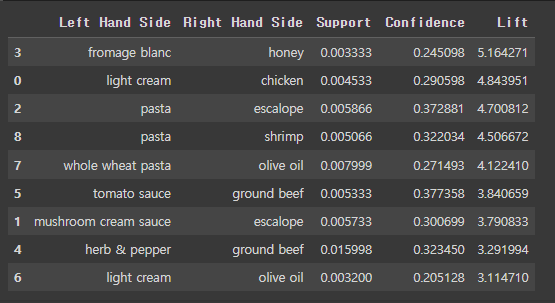 resultsinDataFrame = pd.DataFrame(inspect(results), columns = ['Left Hand Side', 'Right Hand Side', 'Support', 'Confidence', 'Lift'])