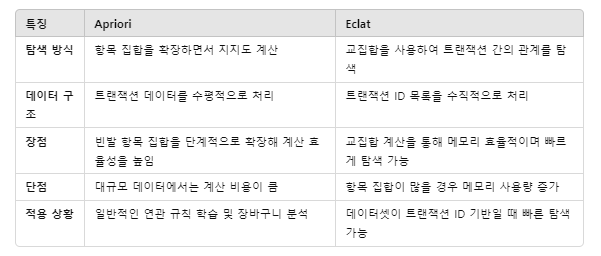 ![]() 두 알고리즘 모두 연관 규칙 학습을 위한 강력한 도구이지만, 데이터셋의 크기와 특성에 따라 적합한 알고리즘을 선택하는 것이 중요합니다. Apriori는 단계적으로 데이터를 확장하고, Eclat는 수직적 탐색을 통해 빠르게 빈발 항목을 찾아냅니다. |