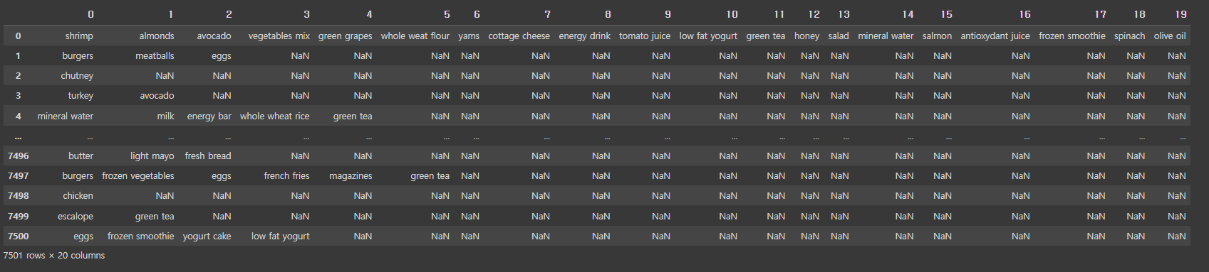 | [['shrimp', 'almonds', 'avocado', 'vegetables mix', 'green grapes', 'whole weat flour', 'yams', 'cottage cheese', 'energy drink', 'tomato juice', 'low fat yogurt', 'green tea', 'honey', 'salad', 'mineral water', 'salmon', 'antioxydant juice', 'frozen smoothie', 'spinach', 'olive oil'], ['burgers', 'meatballs', 'eggs', 'nan', 'nan', 'nan', 'nan', 'nan', 'nan', 'nan', 'nan', 'nan', 'nan', 'nan', 'nan', 'nan', 'nan', 'nan', 'nan', 'nan'], ['chutney', 'nan', 'nan', 'nan', 'nan', 'nan', 'nan', 'nan', 'nan', 'nan', 'nan', 'nan', 'nan', 'nan', 'nan', 'nan', 'nan', 'nan', 'nan', 'nan'], .... |