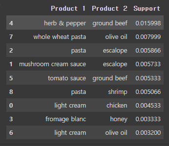 resultsinDataFrame = pd.DataFrame(inspect(results), columns = ['Product 1', 'Product 2', 'Support'])