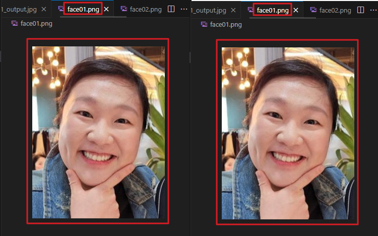 | [ 다른 사진을 넣었을 때 ] ![]() ![]() ㄴ 닮은 꼴인 경우라도, 다른 사람이라면 타인이라는 것을 정확히 인식함 -> 성능이 좋다 [ 같은 사진을 넣었을 때 ] ![]() ![]() |