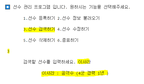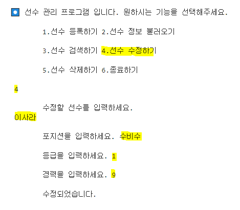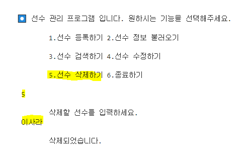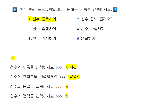 menu = int(input('1.선수 등록하기 2.선수 정보 불러오기 3.선수 검색하기 4.선수 수정하기 5.선수 삭제하기 6.종료하기'))