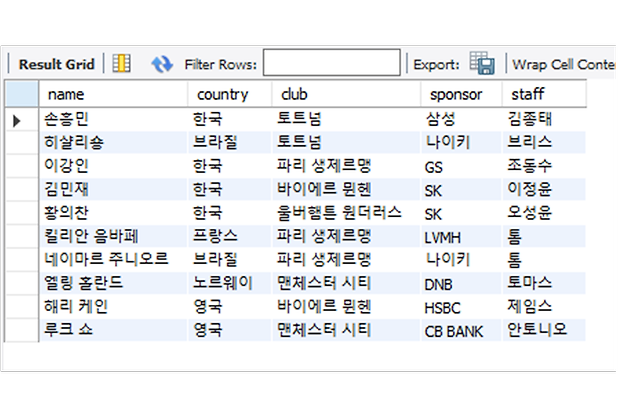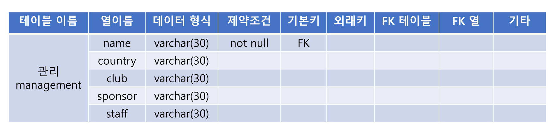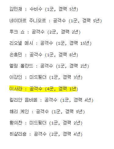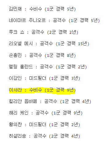 : 선수가 속한 나라 (ex. 한국, 브라질, 영국, 프랑스, 아르헨티나...)
