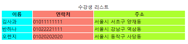 colgroup 태그 - 컬럼(th 또는 td)에 적용할 스타일을 설정할 수 있도록 함 caption 태그 - 표에 제목을 붙일 때 사용 - 기본 위치는 표의 상단 중앙 |