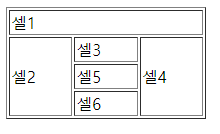 <td rowspan="3">셀2</td><td>셀3</td><td rowspan="3">셀4</td>