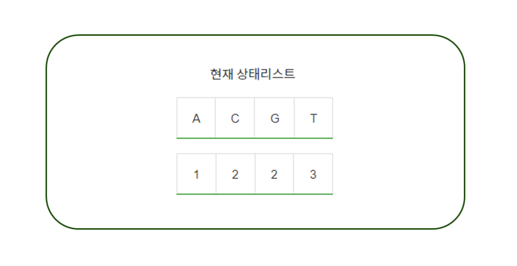 | 3번째 줄에 부분 문자열에 포함돼야 할 {'A','C','G','T'}의 최소 개수 | |