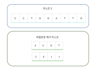 | 1.# 전역변수 선언 checkList(비밀번호 체크 리스트) myList(현재 상태 리스트) checkSecret(몇 개의 문자와 관련된 개수를 충족했는지 판단하는 변수) 2. # 함수 선언 myadd(문자 더하기 함수): myList에 새로운 값을 더하고 조건에 따라 checkSecret 값 업데이트 myremove(문자 빼기 함수): myList에 새로운 값을 제거하고 조건에 따라 checkSecret 값 업데이트 3. # 메인코드 S (문자열 크기) P (부분 문자열 크기) A (문자열 데이터) checkList 받기 checkList를 탐색하여 값이 0인 데이터의 개수만큼 checkSecret 값 증가 #값이라는 것은 비밀번호 개수가 이미 만족되었다는 뜻 P 범위(0 ~ P - 1) 만큼 myList 및 checkSecret에 적용하고, 유효한 비밀번호인지 판단 4. for i를 P에서 S까지 반복: j 선언 ( i - P ) # 이 부분은 myadd, myremove 함수로 별도 구현 한 칸씩 이동하면서 제거되는 문자열과 새로 들어오는 문자열을 처리 유효한 비밀번호인지(checkSecret == 4) 판단해 결괏값을 업데이트 5. 결괏값 출력 |